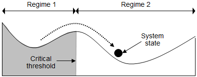 Different regimes can be metaphorically represented by a ball-and-cup diagram. The valleys or cups represent different regimes or fundamental ways in which the system can function and be structured. A regime shift entails a shift in the current system state (represented as a ball) from one cup or valley to another. While in a particular regime, it is important to note that the system does not remain stable but fluctuates around.